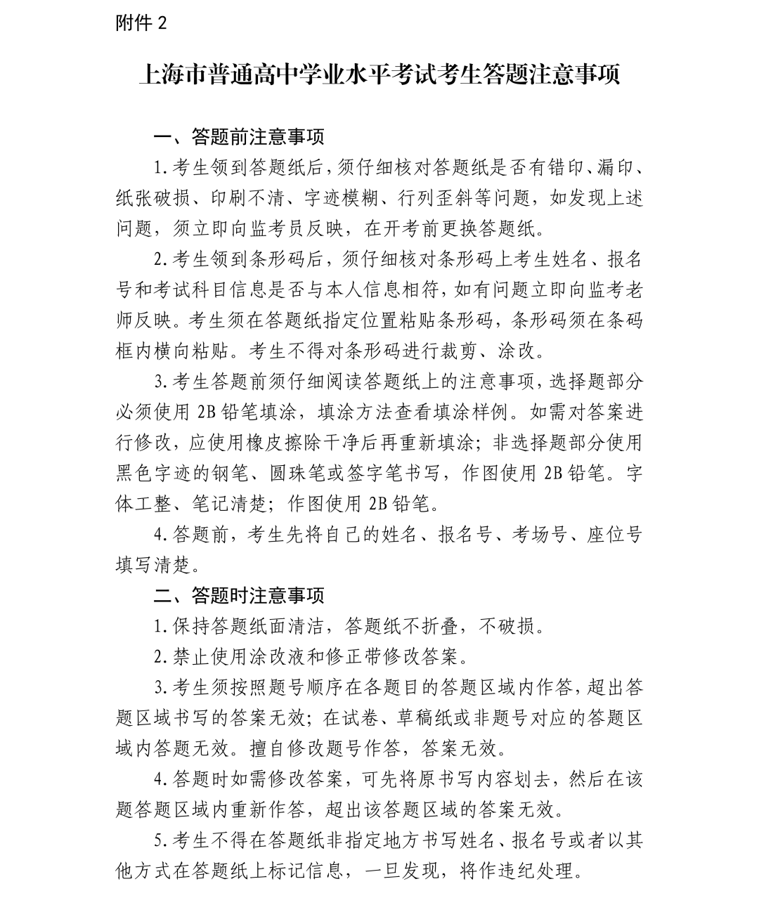6.请考生仔细阅读《上海市普通高中学业水平考试笔试科目考试考场规则》(附件1-附文末)和《上海市普通高中学业水平考试考生答题注意事项》(附件2-附文末),诚信考试。警惕网上虚假信息,保护自身利益。如有违规、违法行为将参照《国家教育考试违规处理办法》(教育部令第33号)(摘要)或《中华人民共和国刑法修正案(九)》(摘要)严肃处理。