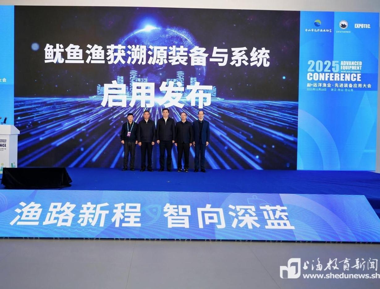在“AI+远洋渔业”先进装备应用大会上,由上海海洋大学陈新军教授与曹守启教授团队牵头研发的我国首套远洋鱿鱼全过程溯源装备正式发布。