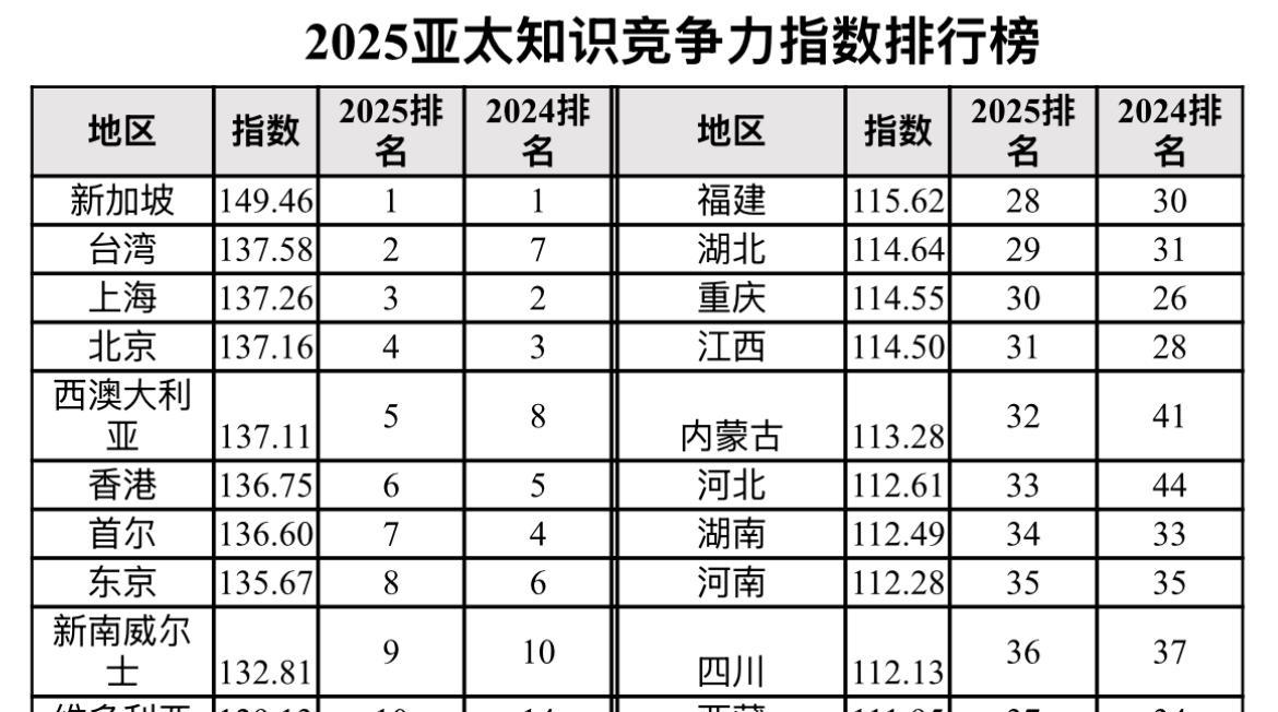 该指数对亚太54个地区用19项指标进行评估,综合反映了各地区将知识资本转化为经济价值和居民财富的能力。今年排行榜的前三名分别被新加坡和中国台湾与上海夺得。