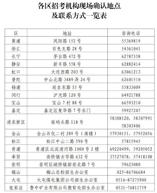 (2)现场确认:考生完成网上报名报考后,须进行报名报考信息的现场确认。若未在规定时间内完成确认,视为本次报名报考无效。现场确认时间为11月30日至12月1日(9:00至11:00,13:00至16:00),请考生与家长持网上报名所用的有效证件和初中毕(结)业证书[年满18周岁的考生可不提供初中毕(结)业证书]到报名地所在的区招考机构办理现场确认手续,现场确认地点详见↓。考生和家长应仔细核对报名报考信息确认表上的信息,并签字确认。