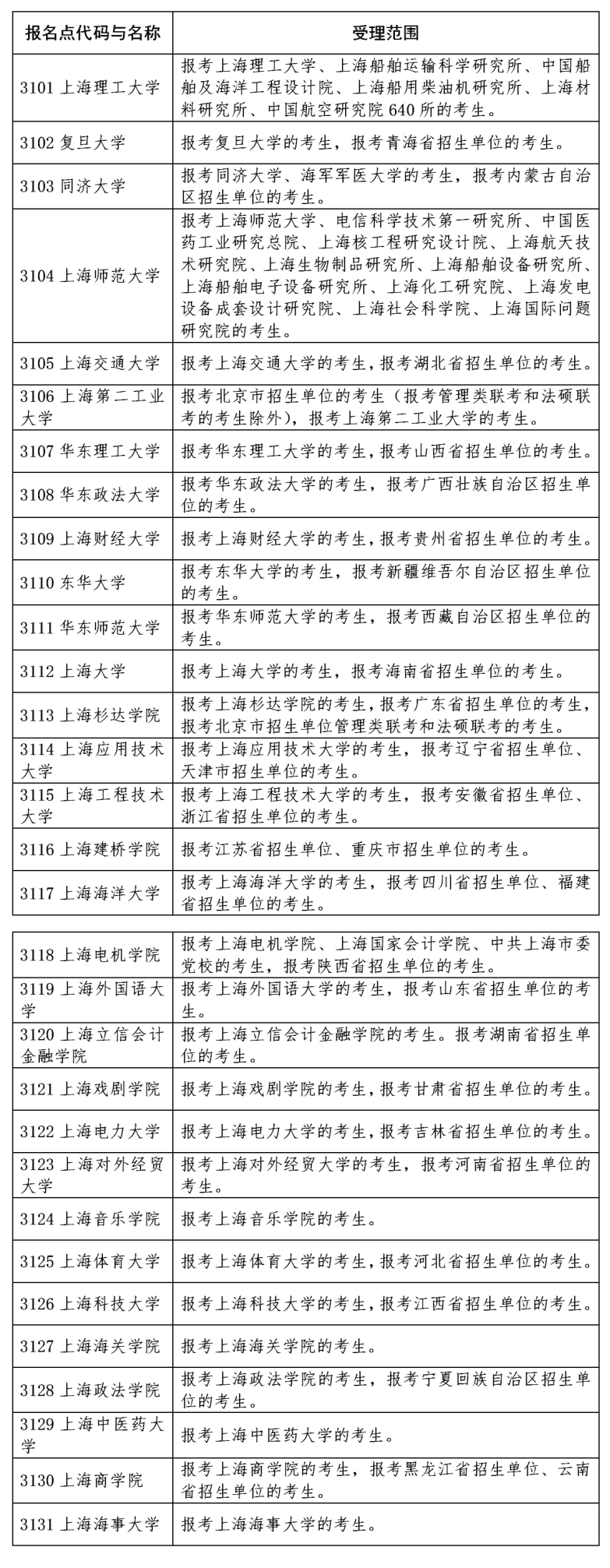 研考|上海市2026年全国硕士研究生招生考试考生网上确认报名点安排表