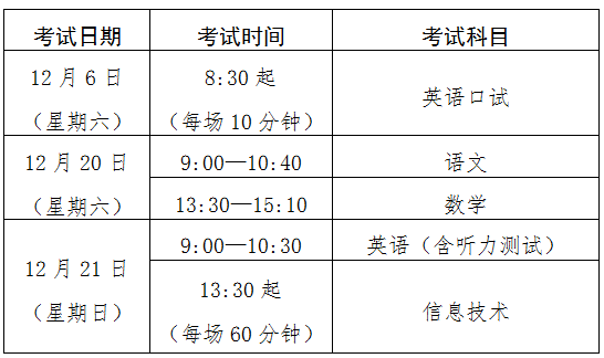 考试科目包括语文、数学、英语和信息技术。语文、数学科目采用笔试方式,时间均为100分钟。