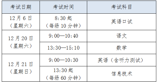 各区招生考试机构(以下简称“区招考机构”)可通过登录上海市中职校学业水平考试信息管理系统(以下简称“考试管理系统”),于10月30日至11月4日组织本区学生的报名工作。考试科目和考试时间见下表: