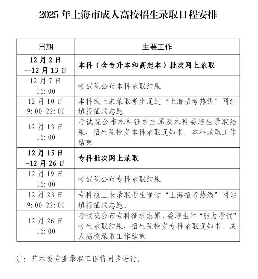 2025年上海市成人高校招生录取工作将于2025年12月2日至2025年12月26日进行。录取将分为两个批次三个层次进行:本科批次(含高中起点升本科、专科起点升本科层次)和专科批次(高中起点升专科层次)。考生可根据录取日程安排(详见下方),及时查询录取结果和了解征求志愿等信息。