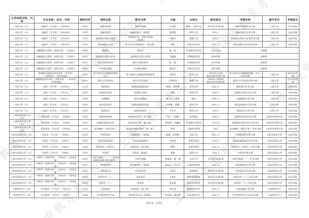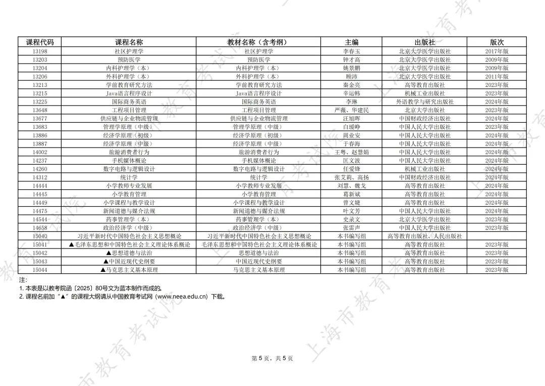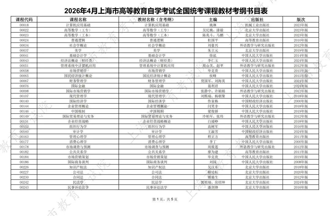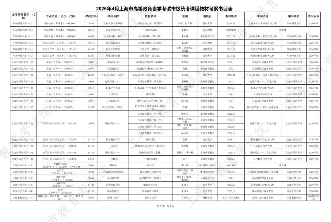 2026年4月上海市高等教育自学考试全国统考和市级统考课程教材考纲书目表公布,详见↓