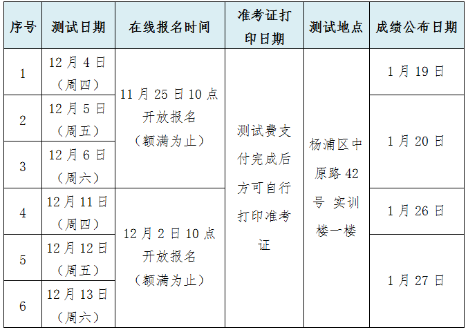 考生提交报名信息后,个人信息及测试日期均不可更改,具体报到时间请以准考证为准。