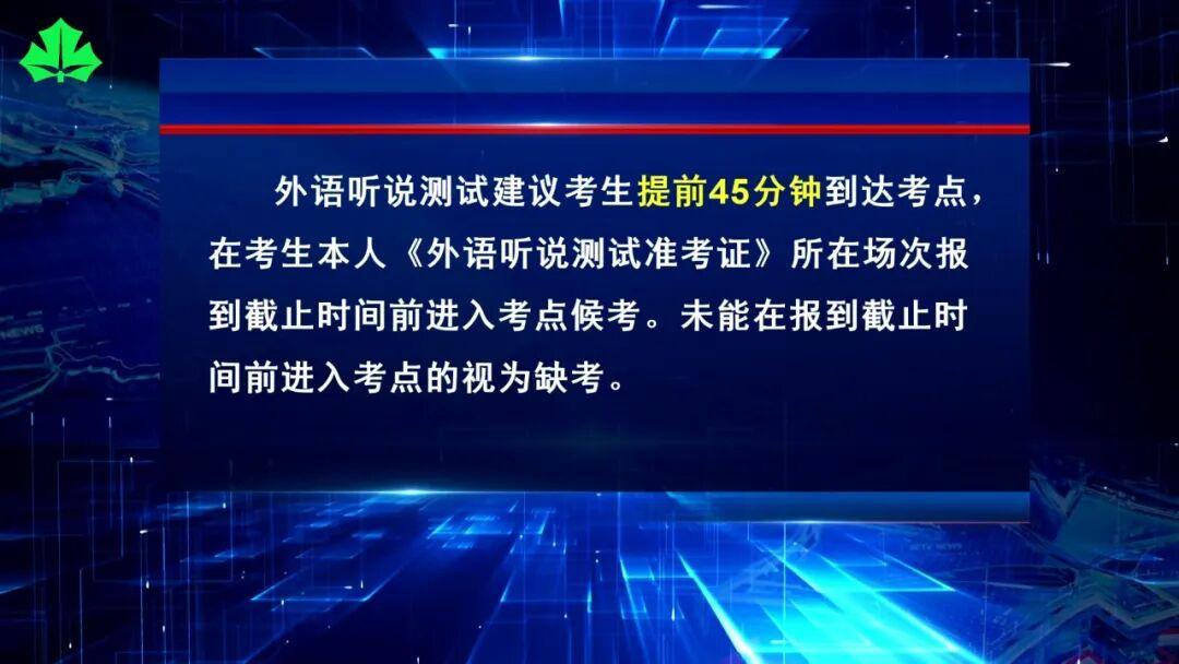 特别需要提醒广大考生的是,外语听说测试建议考生提前45分钟到达考点,在考生本人《外语听说测试准考证》所在场次报到截止时间前进入考点候考。未能在报到截止时间前进入考点的视为缺考。