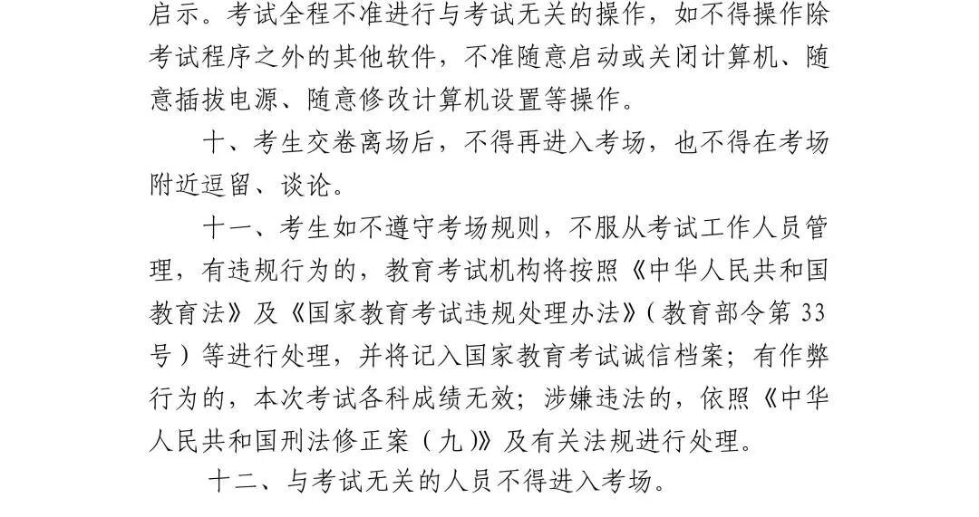 2.诚信参加考试。考试期间,教育、公安、网信、无线电管理等部门将对考场内及周边环境进行整治,对涉嫌利用通讯工具作弊人员进行严肃查处,涉嫌犯罪的追究刑事责任。考生须认真阅读并自觉遵守六科合格性考试《考场规则》和《考生作答须知》,诚信考试。作弊和违规行为将按《刑法》《教育法》《国家教育考试违规处理办法》《最高人民法院 最高人民检察院关于办理组织考试作弊等刑事案件适用法律若干问题的解释》严肃处理。
