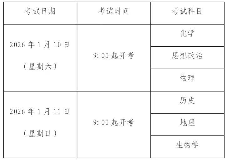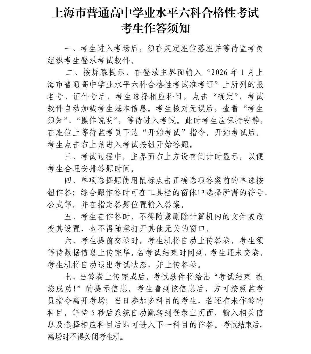 2026年1月上海市普通高中学业水平六科合格性考试将于1月10日至11日举行。本次考试采用上机考试的形式,考试科目和时间安排如下: