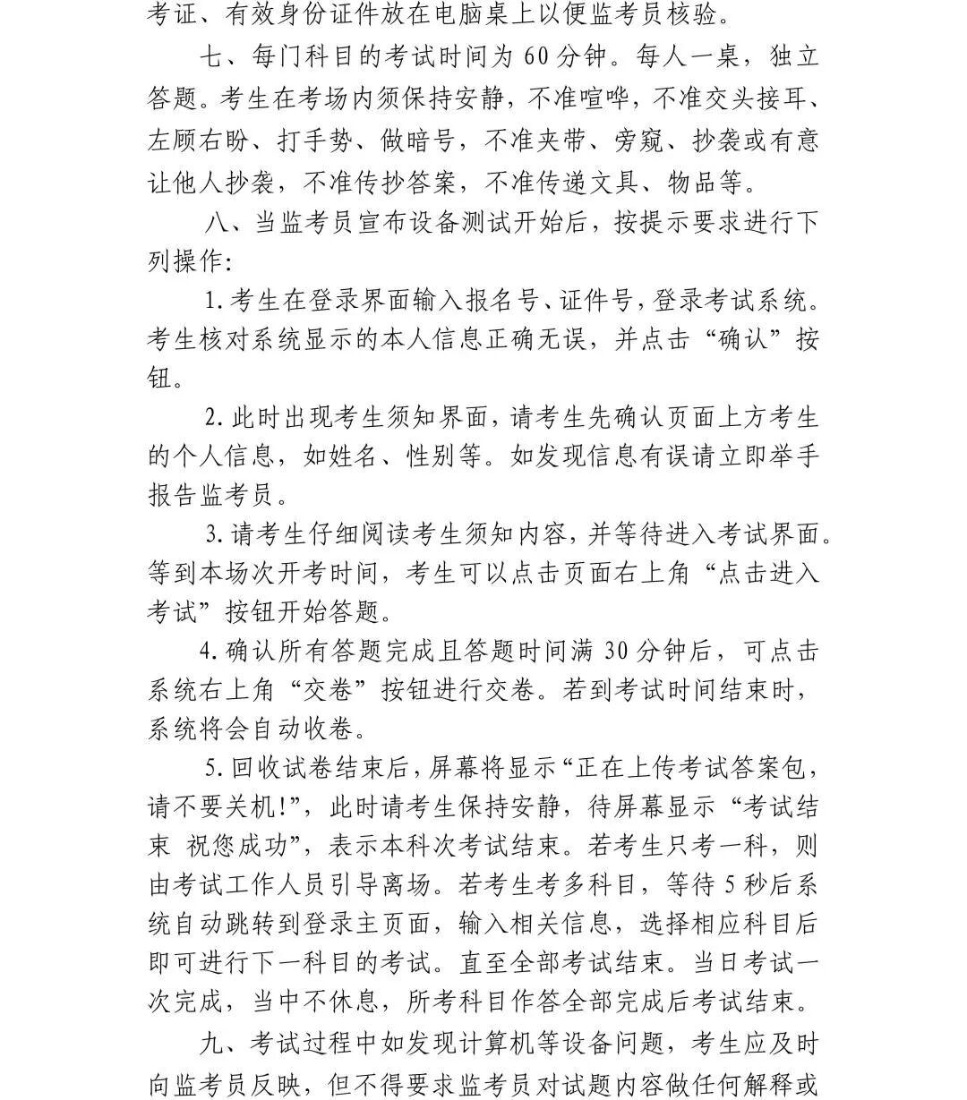 1.带齐两证赴考。考生须凭本人当天考试科目准考证和有效身份证件原件(含居民身份证、有照片的社保卡、驾驶证、护照、军人证),严格按照准考证上的规定时间和考点参加考试,请仔细阅读准考证上的说明和要求,妥善保管好准考证,考前和考中均不得在准考证正反面做任何标记。
