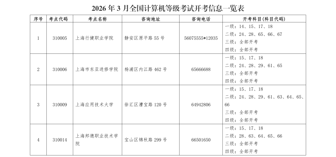 本次报名除上海杉达学院光彪学院考点(310034)外,其他考点均对社会考生开放,开考信息详见《2026年3月全国计算机等级考试开考信息一览表》↓↓↓