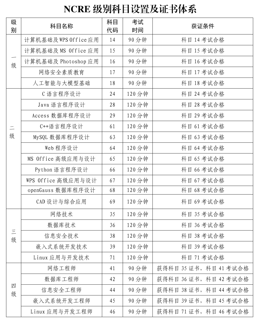 2026年3月(第77次)全国计算机等级考试(NCRE)将于3月28日(星期六)至3月29日(星期日)举行,开考部分科目,相关级别的证书种类、科目代码和获证条件详见《NCRE级别科目设置及证书体系》↓↓↓