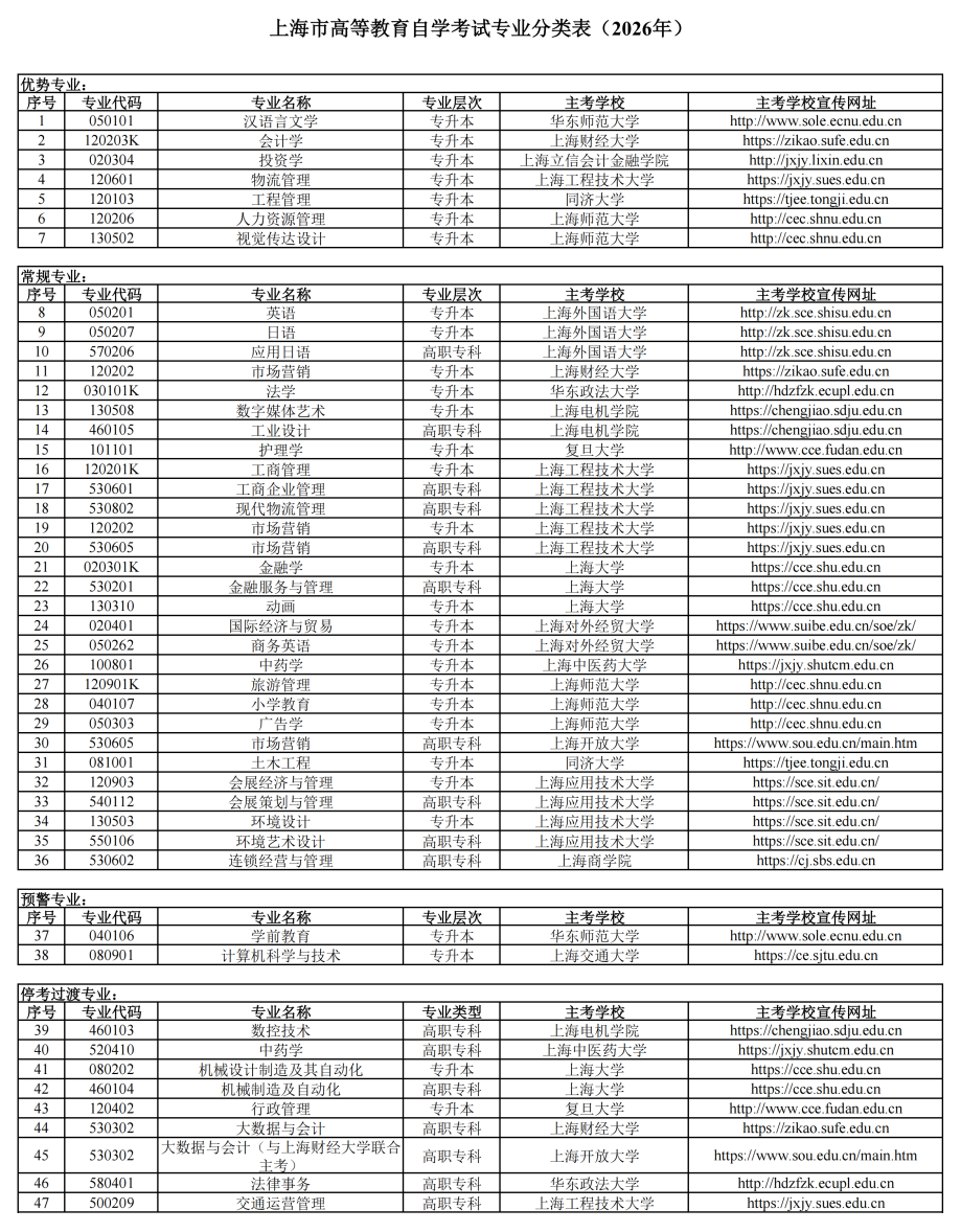 3.2026年1月1日起,除上述9个停考过渡专业及上海工程技术大学“现代物流管理(高职专科)”、上海大学“金融服务与管理(高职专科)”专业外,我市有36个专业执行新考试计划,2026年4月开考新计划课程,请考生留意相关变化,做好学业规划。