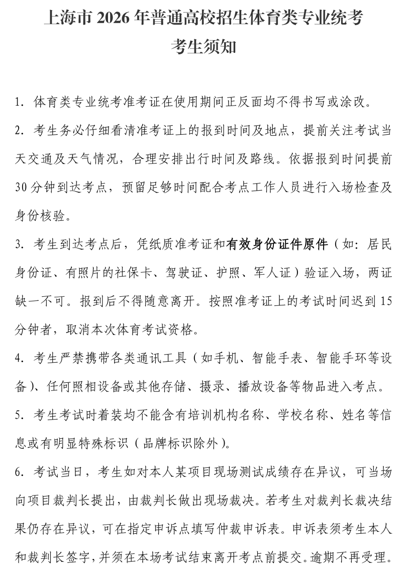 上海市2026年普通高校招生体育类专业统考将于3月14日(星期六)至15日(星期日)在上海体育大学举行。