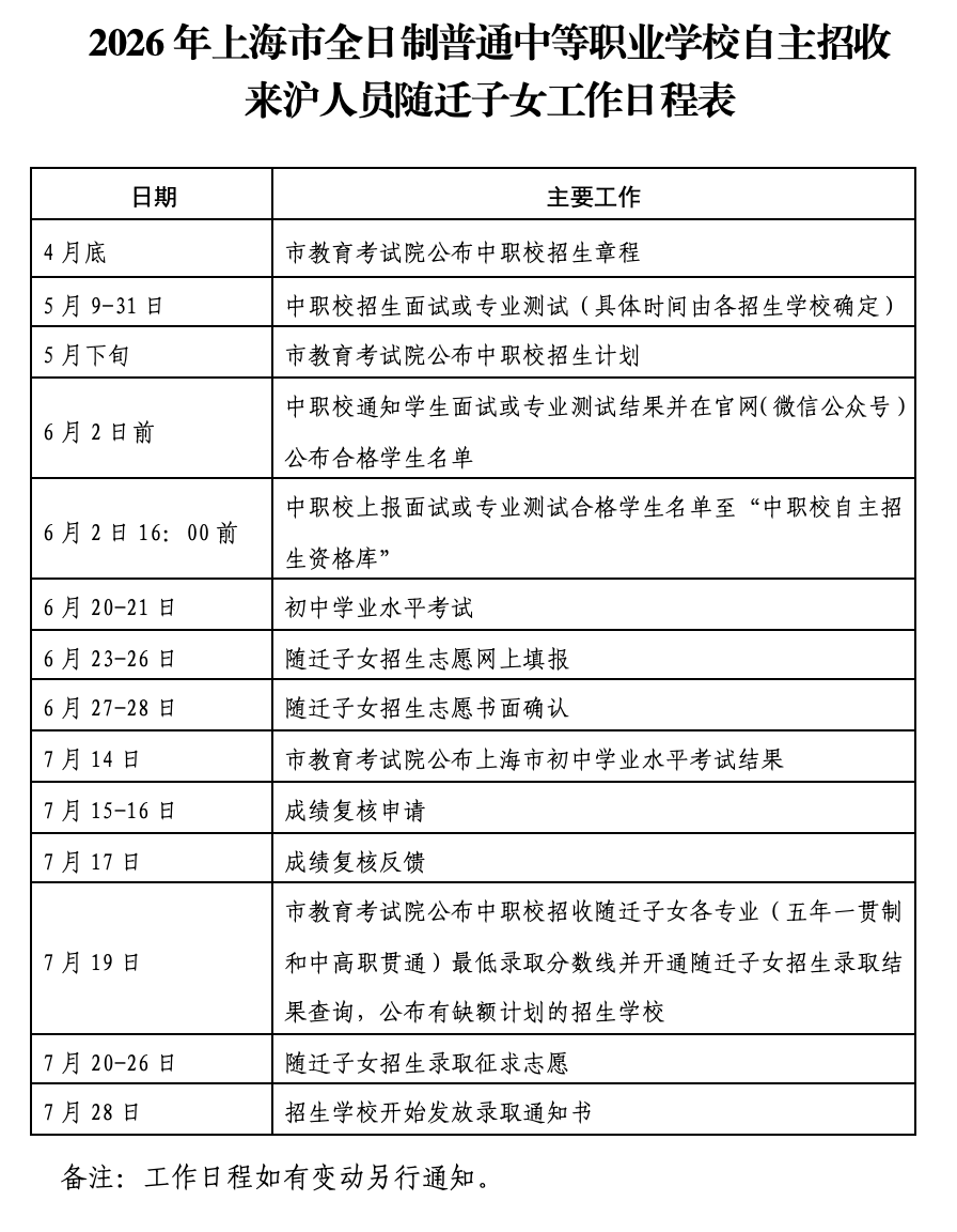 面试或专业测试的科目要求等由招生学校自行确定并及时向社会公布。招生学校须按照《2026年上海市全日制普通中等职业学校自主招收来沪人员随迁子女工作日程表》(见下图)安排面试或专业测试时间。
