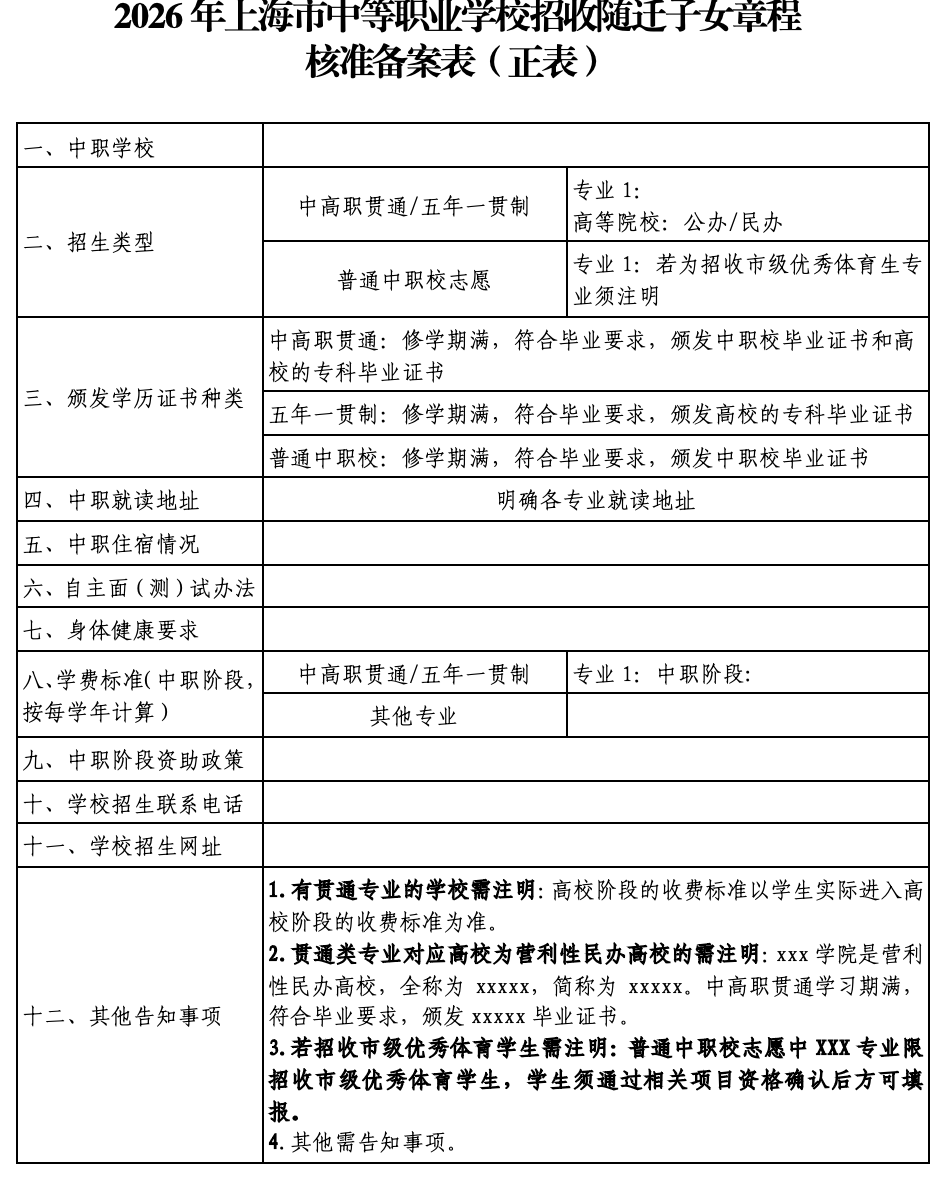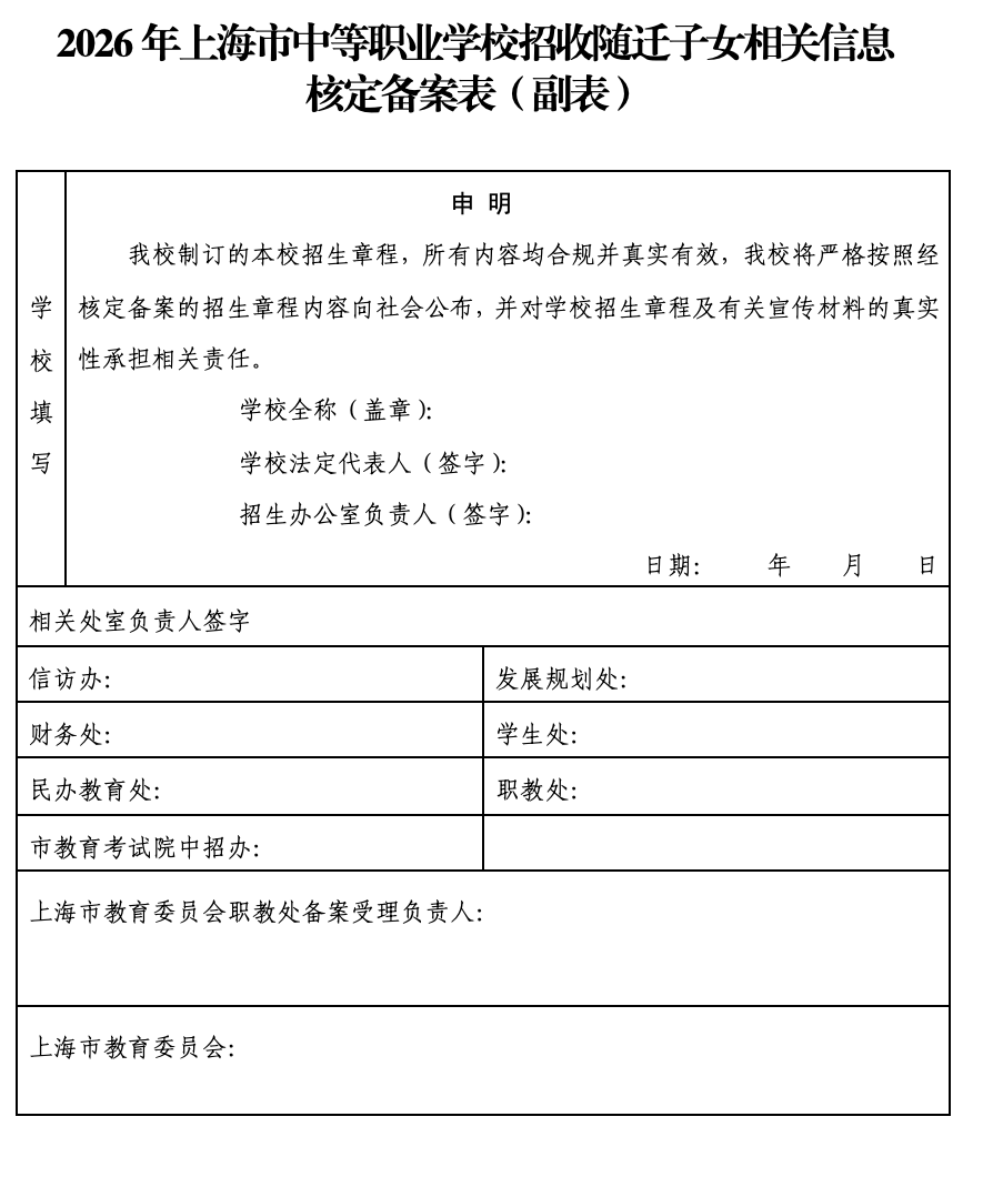 各招生学校须于2026年3月下旬完成招生章程制定,并填报《2026年上海市中等职业学校招收随迁子女章程核准备案表(正表)》和《2026年上海市中等职业学校招收随迁子女相关信息核定备案表(副表)》,经上级主管部门(贯通类专业须同时经贯通高校)同意后,报送市教育考试院。市教委对招生章程进行核实、备案。经备案的招生章程不得擅自更改。招生章程经市教委备案后,各招生学校应及时向社会公布。学校法定代表人应对本校招生章程及有关宣传材料的真实性负责。市教委将对招生学校招生章程的执行情况进行督查。