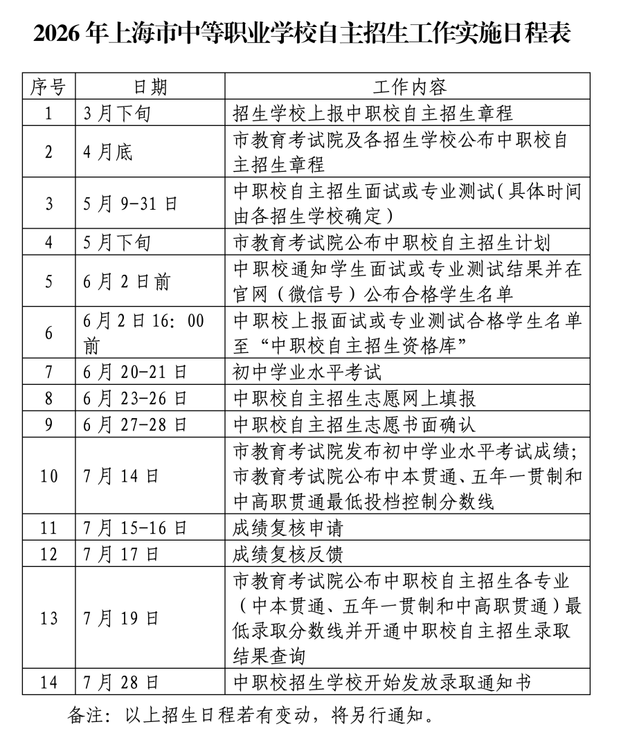 面试或专业测试的科目要求等由招生学校自行确定并及时向社会公布,所有面试或专业测试工作时间节点须按照《2026年上海市中等职业学校自主招生工作实施日程表》(见下图)进行。