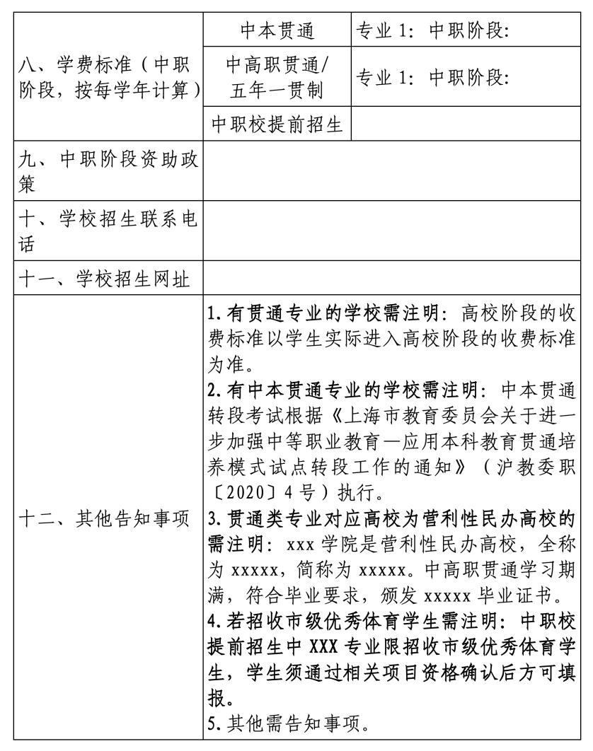 招生学校根据专业特点自主确定中本贯通、五年一贯制和中高职贯通招生是否进行面试或专业测试。中职校提前招生专业限需进行面试或测试,以及需要市级优秀体育学生资格确认的专业。
