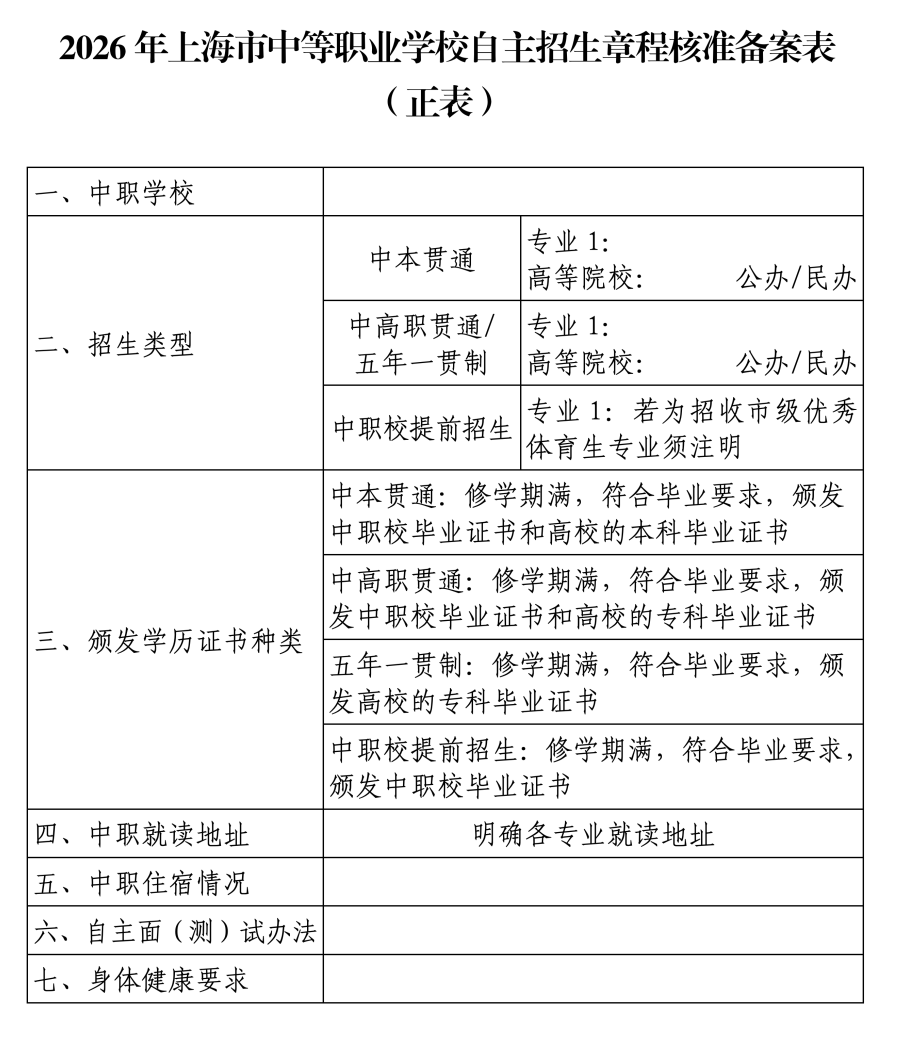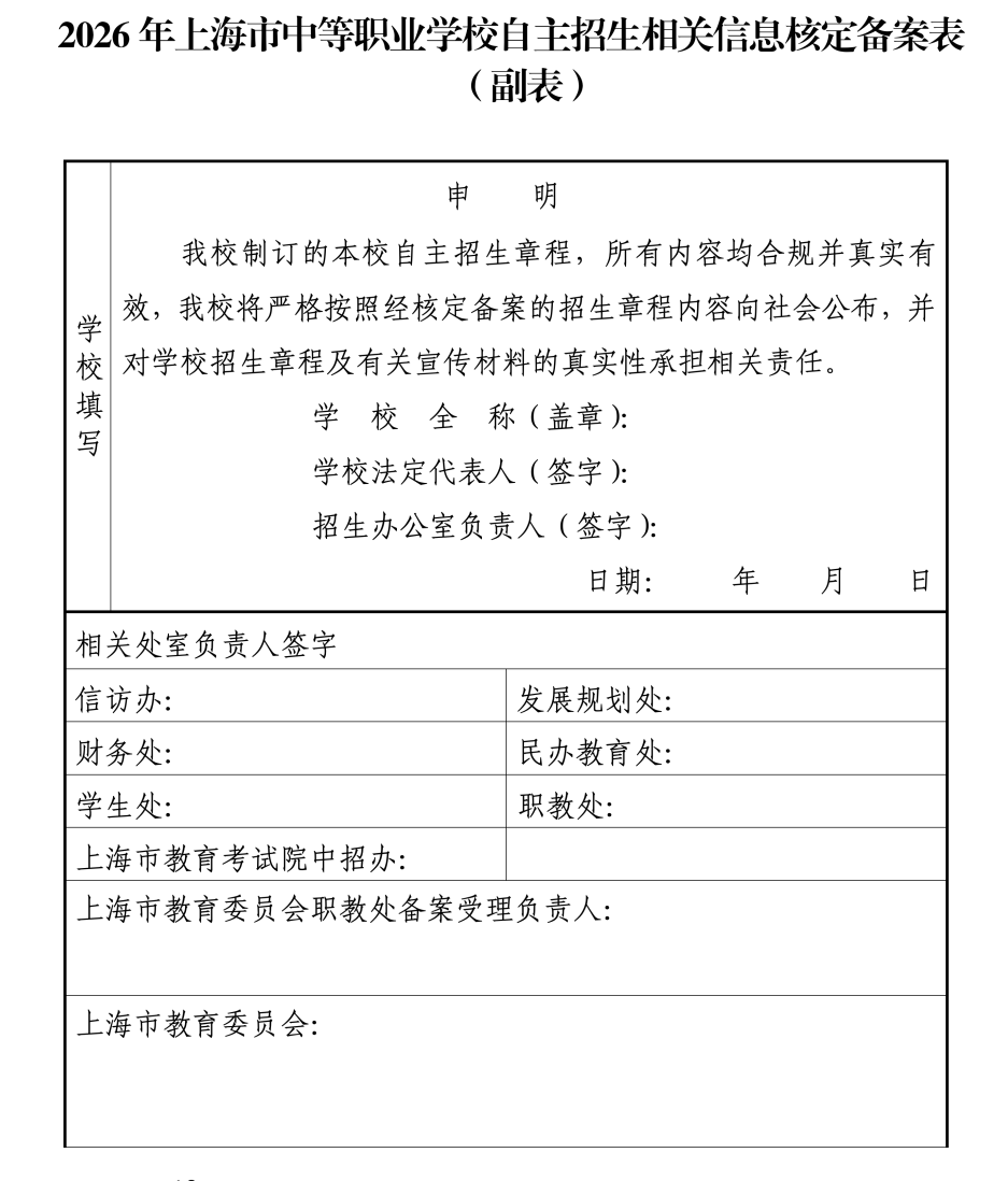 各招生学校须于2026年3月下旬完成自主招生章程制定,并填报《2026年上海市中等职业学校自主招生章程核准备案表(正表)》(见下图)和《2026年上海市中等职业学校自主招生相关信息核定备案表(副表)》(见下图),经上级主管部门(贯通类专业须同时经贯通高校)同意后,报送市教育考试院。市教委对学校招生章程进行核实、备案。经审核备案的招生章程不得擅自更改。招生章程经市教委备案后,各招生学校应及时向社会公布。学校法定代表人应对本校招生章程及有关宣传材料的真实性负责。市教委将对招生学校招生章程的执行情况进行督查。