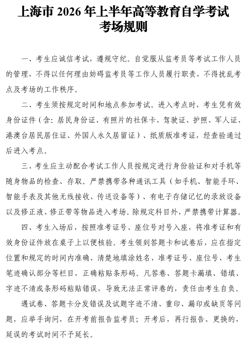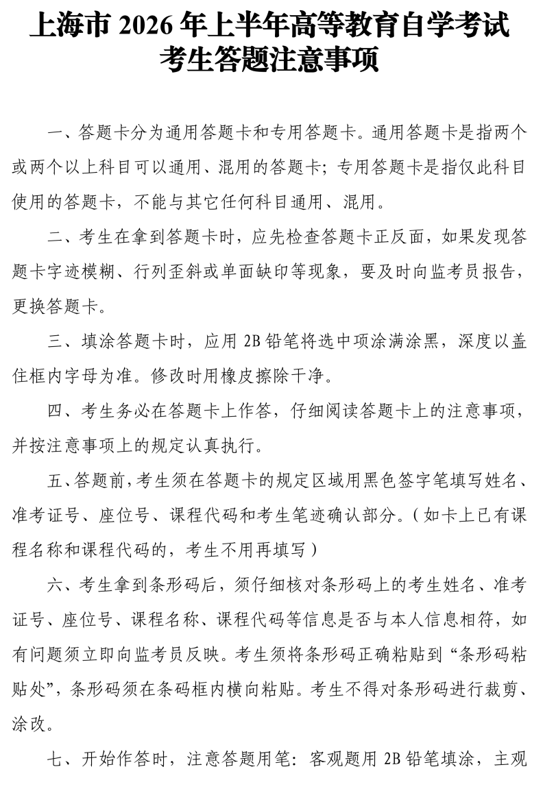 六、考生须认真阅读《上海市2026年上半年高等教育自学考试考场规则》(见文末)及《上海市2026年上半年高等教育自学考试考生答题注意事项》(见文末),了解考试相关规定和要求。