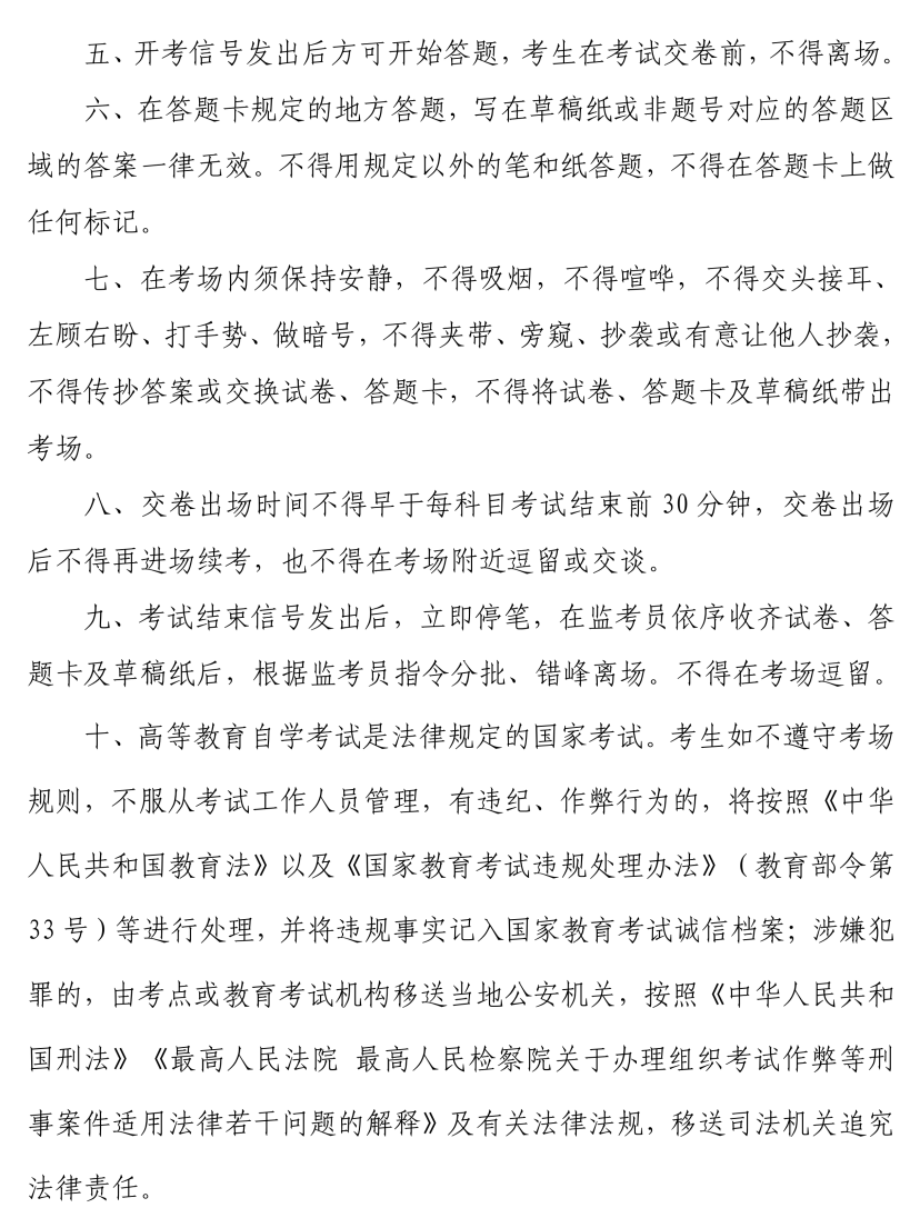 七、高等教育自学考试是法律规定的国家教育考试,考生须自觉遵守国家有关法律法规和考试相关规定。根据《中华人民共和国刑法》《国家教育考试违规处理办法》《最高人民法院 最高人民检察院关于办理组织考试作弊等刑事案件适用法律若干问题的解释》,考生在考试中有违纪行为的,取消该科目的考试成绩;考生在考试中有作弊行为的,取消当次考试所有科目的考试成绩;代替他人或者让他人代替自己参加国家教育考试的,处拘役或者管制,并追究法律责任。考生违纪、作弊行为均将记入国家教育考试诚信档案,请务必严格遵守考试纪律,认真履行诚信考试承诺。