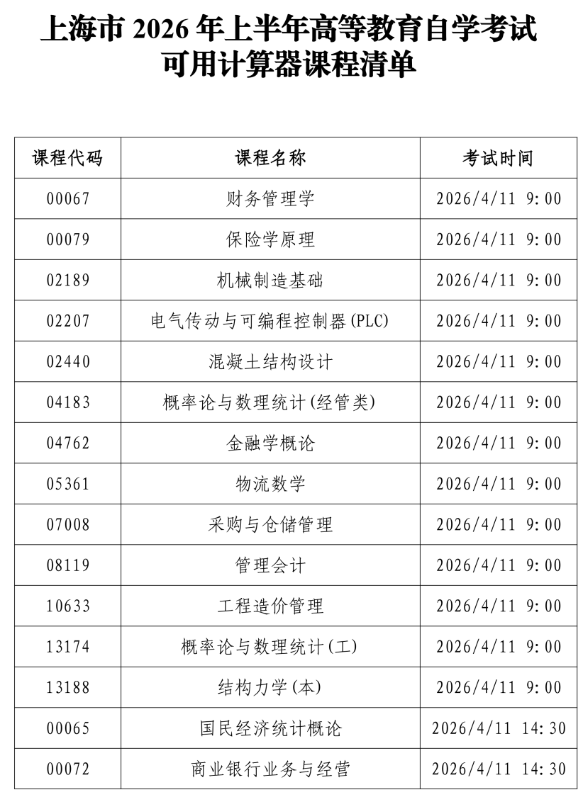 五、根据考试要求,部分课程可使用不带通讯功能、记忆存储功能、图像功能的计算器,具体课程清单见《上海市2026年上半年高等教育自学考试可用计算器课程清单》(见文末)。