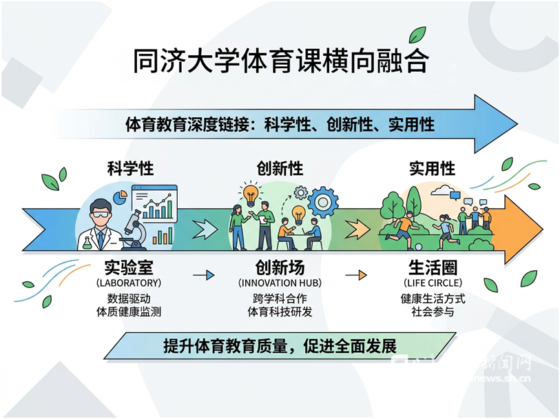 理念落地离不开体系支撑。同济大学打破传统体育课程藩篱,构建“四维贯通”课程新生态,从纵向与横向双向发力,让体育教育贯穿学生成长全过程、延伸至生活各场景。