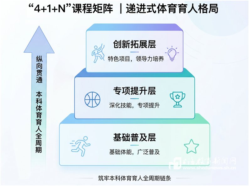 在纵向贯通上,学校打造“4+1+N”课程矩阵,形成“基础普及-专项提升-创新拓展”三层递进格局,筑牢本科体育育人全周期链条。