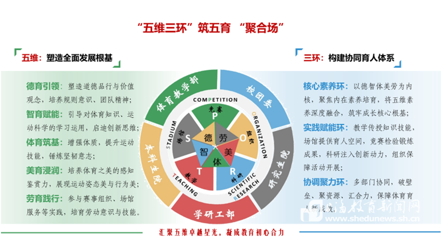 长期以来,“重智轻体”“课程断层”“育人模式单一”是高校体育教育面临的普遍难题。为破解这一困局,同济大学率先发力,以理念重构为突破口,提出“五维三环”体育育人新理念——以“德智体美劳”五育融合为核心(五维),构建“全员参与、全过程渗透、全方位育人”的三全育人闭环(三环)。
